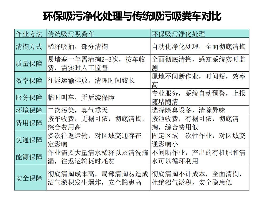 本方案采用无害化清理粪污分离,设备结合了沉淀、过滤、分离、消毒等多种处理技术,能够快速有效地处理化粪池污水。